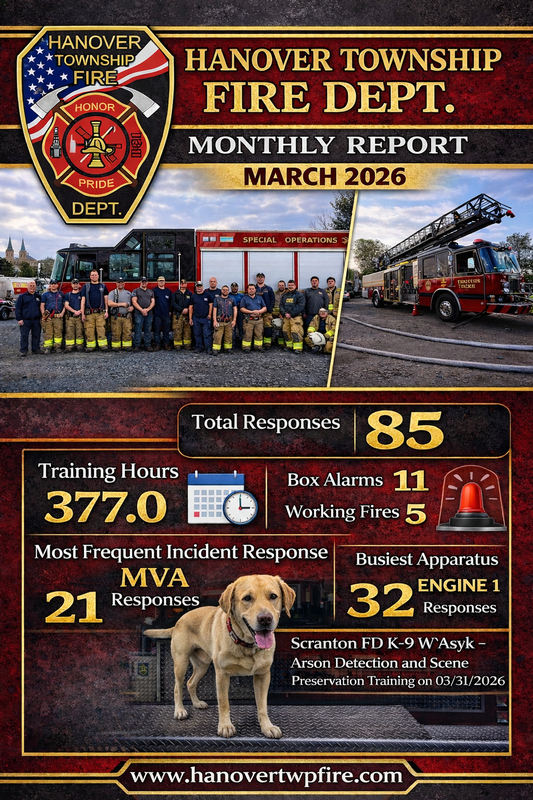 | The Hanover Township Fire Department responded to a total of 85 calls for service during March 2026, continuing its commitment to protecting the residents and surrounding communities of Hanover Township and beyond.