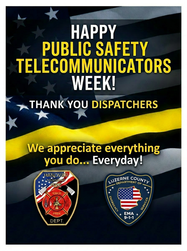 The Hanover Township Fire Department proudly extends its sincere appreciation and gratitude to the men and women of Luzerne County Department of Emergency Services - 911Communications for their unwavering commitment to public safety.
